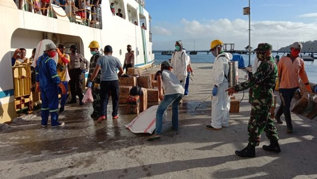 Tribratanews.polrestanimbar.com – Polda Maluku, Polres Maluku Tenggara Barat, Jumat 10 Juli 2020, pukul 07.00 wit bertempat di Pelabuhan Larat Kecamatan Tanimbar Utara Kabupaten Kepulauan Tanimbar Personil gabungan TNI-Polri bersama Tim Kesehatan Penangananan Covid-19, Amankan dan laksanakan Giat Penyemprotan Cairan Disinfektan kedatangan Kapal KM. Sabuk Nusantara 103.