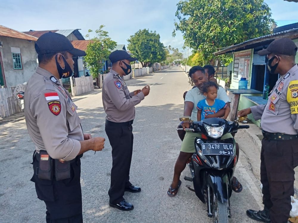 Tribratanews.polrestanimbar.com – Polda Maluku, Polres Maluku Tenggara Barat, Senin 28 September 2020, pukul 09.00 wit, bertempat di Jalan Trans Selaru Kecamatan Selaru Kabupaten Kepulauan Tanimbar P.S. Kanit Bimas Brigpol D. Leatemia bersama 7 (tujuh) Personil Polsek Selaru melaksanakan kegiatan Operasi Yustisi terhadap pelanggar protokol kesehatan di Desa Adaut Kecamatan Selaru Kabupaten Kepulauan Tanimbar oleh Polsek Selaru.