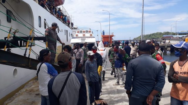 Tribratanews.polrestanimbar.com – Polda Maluku, Polres Maluku Tenggara Barat, Rabu 21 Oktober 2020, pukul 14.00 wit bertempat di Pelabuhan Larat Kecamatan Tanimbar Utara, Personil Polsek Tanimbar Utara bersama Gugus Tugas Kecamatan Tanimbar Utara dan personil TNI amankan kedatangan KM. Sabuk Nusantara 72 dari pelabuhan Ambon.