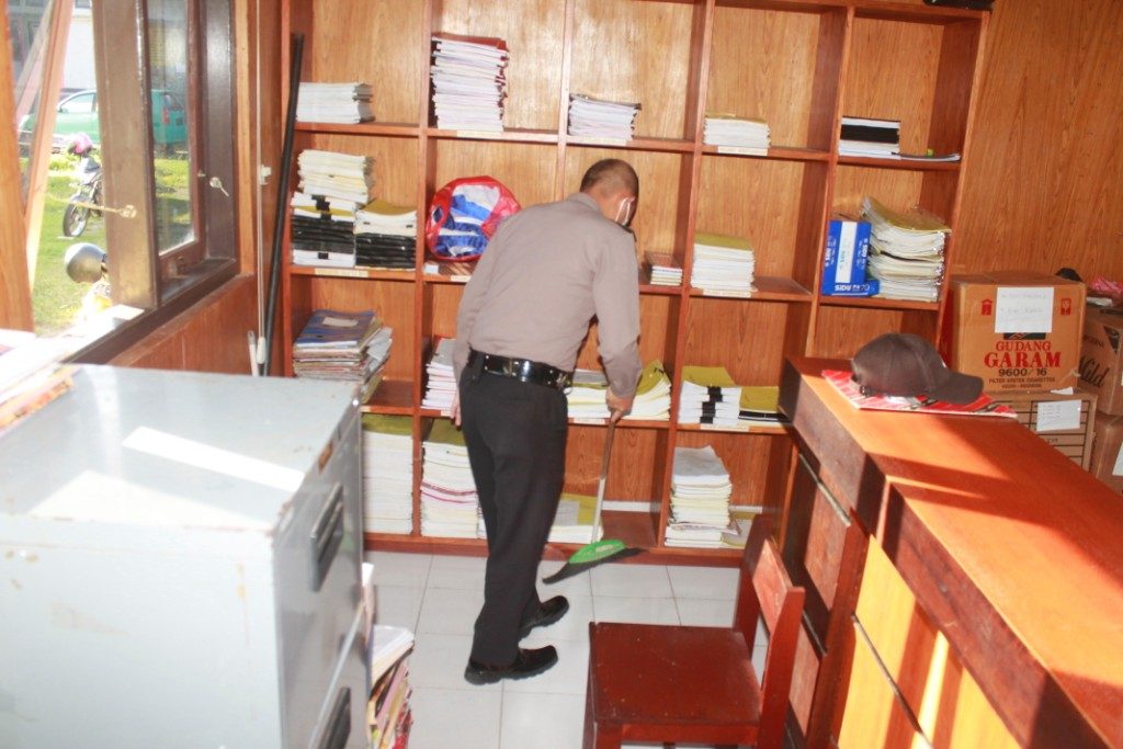 Kegiatan pembersihan yang dilakukan berupa, pembersihan lantai, pembersihan kaca, pembersihan kursi maupun meja kerja serta penataan administrasi.