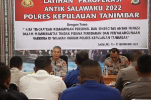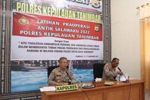 Tribratanews.polrestanimbar.com – Polda Maluku, Polres Kepulauan Tanimbar, Kapolres AKBP Umar Wijaya, S.I.K., Pimpin dan buka secara resmi kegiatan Pelatihan Pra Operasi Antik Salawaku tahun 2022 Polres Tanimbar dengan Tema “Kita tingkatkan kemampuan personel dan sinergitas antar fungsi dalam memberantas Tindak Pidana Peredaran dan Penyalahgunaan Narkoba di wilayah hukum Polres Kepulauan Tanimbar”, Selasa (15/11).