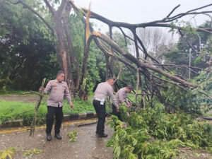 Tribratanews.polrestanimbar.com – Polda Maluku, Kepolisian Resor Kepulauan Tanimbar, Satuan Lalu Lintas Polres Kepulauan Tanimbar bergerak cepat menangani kejadian pohon tumbang yang menutup bahu jalan protokol di ruas Jalan Ir. Soekarno Saumlaki, Kecamatan Tanimbar Selatan, Kabupaten Kepulauan Tanimbar.