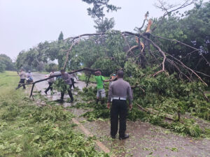 “Melihat adanya gangguan yang membahayakan pengguna jalan, Kami segera lakukan pengamanan lokasi dan berkoordinasi dengan Dinas terkait untuk melakukan evakuasi pohon yang tumbang” ungkapnya.