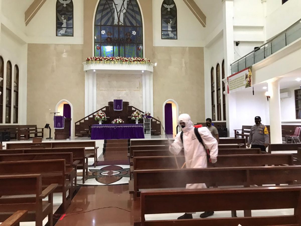Kegiatan Penyemprotan cairan disinfektan ini dilaksanakan guna mencegah penyebaran Virus Covid-19 di lingkungan tempat Ibadah, serta mensterilkan tempat Ibadah bagi Umat Kristen yang akan melaksanakan Ibadah di hari Minggu.