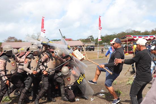 Dilanjutkan dengan skenario penanganan aksi unjuk rasa hingga penanggulangan konflik yang mungkin saja timbul pasca pemungutan suara. Setiap skenario yang diperagakan oleh Personel tentunya dilakukan dengan profesional dengan mengedepankan pendekatan humanis, namun tegas dan terukur dalam menjalankan tugas pengamanan.