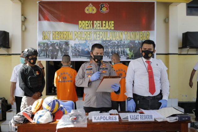 Tribratanews.polrestanimbar.com – Polda Maluku, Polres Kepulauan Tanimbar, Rabu tanggal 02 Juni 2021 bertempat di depan Mako Polres Kepulauan Tanimbar, Kapolres Kepulauan Tanimbar AKBP Romi Agusriansyah, S.I.K., didampingi Kasat Reskrim Iptu Yogie Gultom, S.T.K., menggelar Press Release Pengungkapan kasus Pencurian.