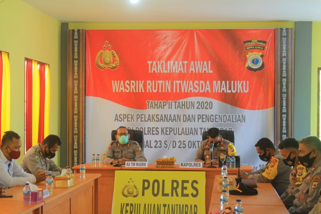 Tribratanews.polrestanimbar.com – Polda Maluku, Polres Maluku Tenggara Barat, Jumat 23 Oktober 2020, Polres Kepulauan Tanimbar menerima kunjungan Tim Wasrik Itwasda Maluku tahap II tahun 2020 Apek Pelaksanaan dan Pengendalian.