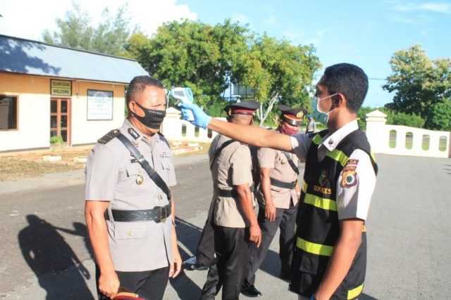 Kapolres Maluku Tenggara Barat AKBP Adolof Bormasa,S.H.,M.H., mengatakan, pemeriksaan suhu tubuh ini dilakukan untuk mengantisipasi penularan Covid-19 bagi setiap personel yang sedang bertugas.