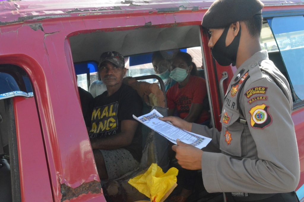 Setiap kendaraan yang melewati jalan raya pada Kota Saumlaki diberikan brosur Maklumat Kapolri,adapun Maklumat Kapolri ditempelkan juga pada Mobill penumpang.Personil Polres juga menghimbau kepada para penumpang untuk tetap menjaga jarak didalam mobil serta gunakan masker disetiap aktifitas.