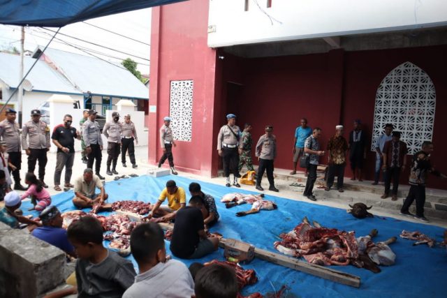 Tribratanews.polrestanimbar.com – Polda Maluku, Polres Kepulauan Tanimbar, Pemotongan dan Pembagian hewan kurban rangkaian Perayaan hari Raya Idul Adha 1443 H / 2022 M di Tanimbar berlangsung aman dan lancar dengan Pengamanan personil Polres Tanimbar. Minggu (10/07).