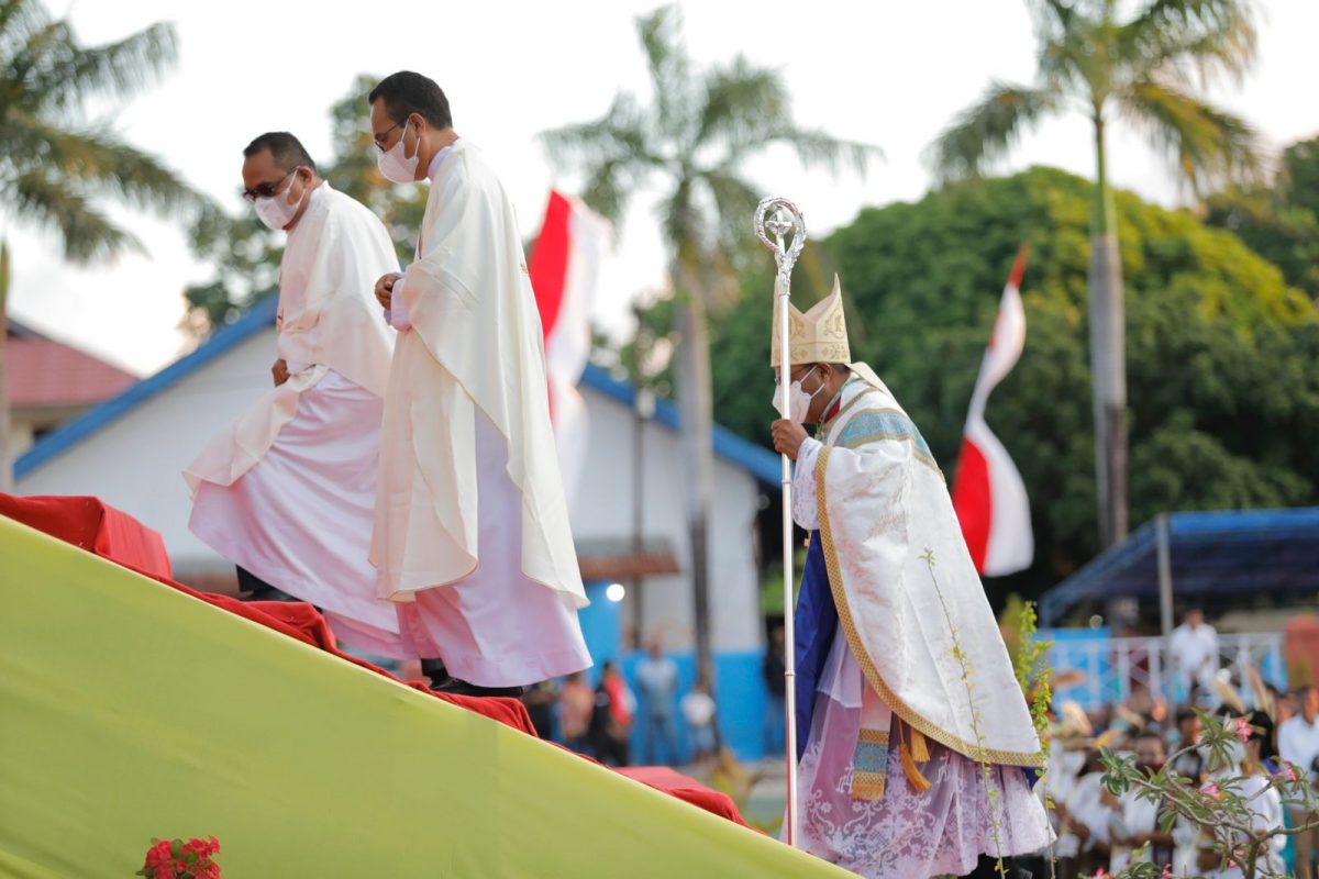 Tribratanews.polrestanimbar.com – Polda Maluku, Polres Kepulauan Tanimbar, Kegiatan Misa Episkopal Uskup Diosis Amboina di lapangan Mandriak Saumlaki mendapatkan Pengamanan personil Polres Tanimbar dan TNI. Selasa (18/05/2022), pukul 17.45 wit.