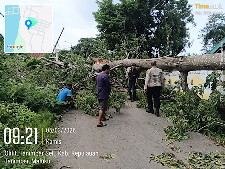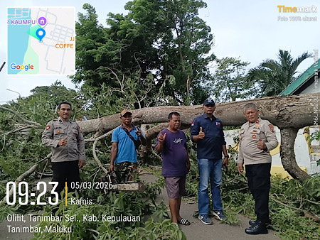 Tribratanews.polrestanimbar.com – Polda Maluku, Kepolisian Resor Kepulauan Tanimbar, Jajaran Polsek Tanimbar Selatan kembali menunjukkan gerak cepat dalam menanggapi gangguan fasilitas umum dengan melakukan aksi pembersihan pohon tumbang yang menutup akses jalan masuk Desa Olilit Barat, Kecamatan Tanimbar Selatan, Kabupaten Kepulauan Tanimbar, Kamis (05/03/26).