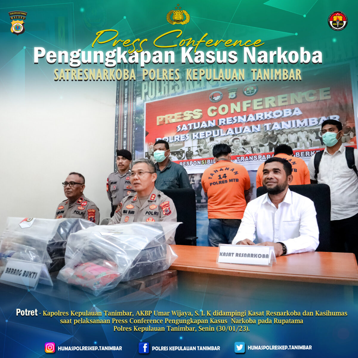 Tribratanews.polrestanimbar.com – Polda Maluku, Kapolres Kepulauan Tanimbar AKBP Umar Wijaya S.I.K Pimpin Press Conference terkait Kasus Narkoba yang didampingi oleh Kasat Resnarkoba AKP Idris Muhkadar bersama Kasi Humas Iptu O. Batlayeri yang bertempat di Ruang Rapat Polres Kepulauan Tanimbar, Senin (30/1/23).