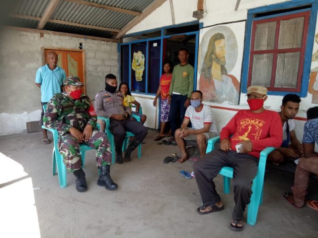 Bhabinkamtibmas Desa Werain Bripda Wanto Isran bersama Babinsa Desa Werain Serka Aris, Menyambangi beberapa masyarakat Desa Werain yang sementara duduk.