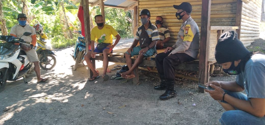 Bhabinkamtibmas melaksanakan giat Edukasi, Sosialisasi dan Himbauan Pendisiplinan penerapan protokol kesehatan pencegahan Covid-19 dan Adaptasi Kebiasaan Baru.