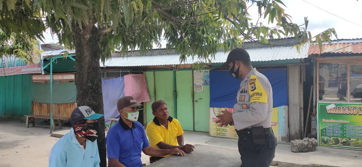 Bhabinkamtibmas melaksanakan giat Edukasi, Sosialisasi dan Himbauan Pendisiplinan penerapan protokol kesehatan pencegahan Covid-19 dan Adaptasi Kebiasaan Baru.