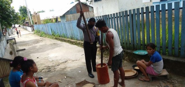 Bhabinkamtibmas Desa Wermatang Bripka K.Fenanlampir, Melaksanahkan giat kunjungan pada warga yang sementara menumbuk jagung.
