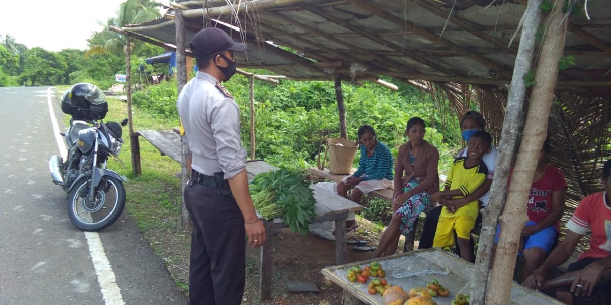 Bhabinkamtibmas Desa Kabiarat BRIGPOL D. Poceratu, sambangi warga desa kabiarat yang berjualan sayur-mayur, BhabinKamtibmas melaksanakan Giat Binluh Tentang Maklumat Kapolri Nomor : Mak/2/III/2020 Tanggal 19 Maret 2020 Tentang Kepatuhan Terhadap Kebijakan Pemerintah Dalam Penanganan Penyebaran Virus Corona (Covid-19).