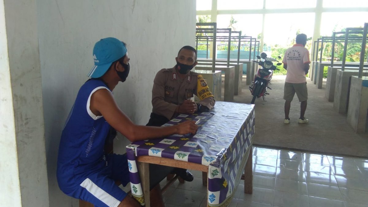 Tribratanews.polrestanimbar.com – Polda Maluku, Polres Maluku Tenggara Barat, Rabu 07 Oktober 2020, pukul 13.30 wit bertempat di Pasar Desa Kabiarat Kecamatan Tanimbar Selatan Kabupaten Kepulauan Tanimbar Bhabinkamtibmas Desa Kabiarat Bripka D. Poceratu sambangi Saudara Wisnu Kamamas warga masyarakat desa kabiarat, guna menyampaikan arahan tentang Edukasi, Sosialisasi dan Himbauan Pendisiplinan penerapan protokol kesehatan pencegahan Covid-19 dan Adaptasi Kebiasaan Baru.