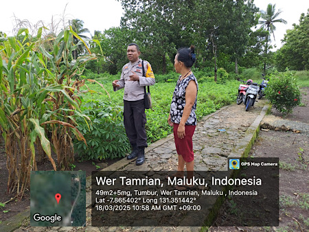 Seperti yang tampak dilakukan oleh Bhabinkamtibmas Desa Tumbur, Polsek Wertamrian, Aipda CHR. TETELEPTA dalam menyambangi Warga Petani yang sedang beraktifitas pada kebun jagung yang berlokasi di pekarangan rumah miliknya. pada Desa Tumbur, Kecamatan Wertamrian, Kabupaten Kepulauan Tanimbar, Selasa (18/03/25).