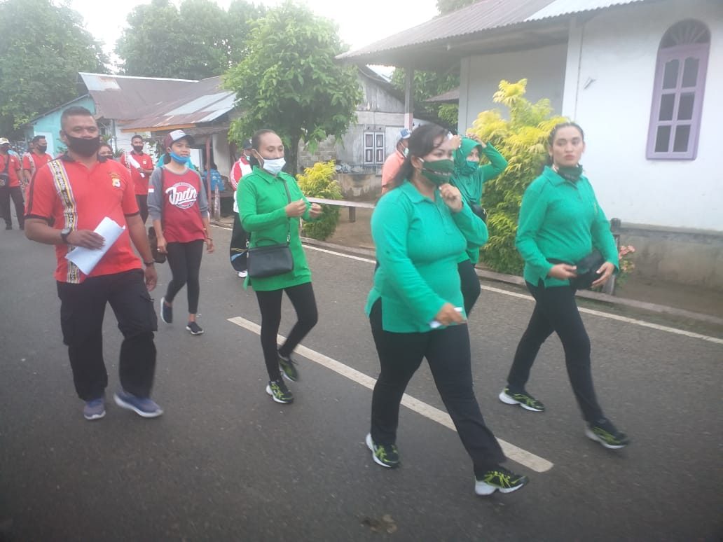 - Pukul 06.45 wit, selesai apel dilanjutkan dengan Jalan Santai di seputaran Desa Adaut sekaligus mensosialisasikan Program Pemerintah tentang New Normal Life kepada Masyarakat dengan Komitmen Mengimplementasikan Protokol Kesehatan dan pembagian brosur cara hidup sehat.