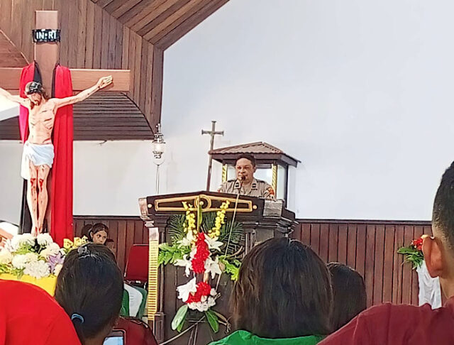 Minggu Kasih yang dipimpin oleh Wakapolsek Tanimbar Selatan Ipda P. DIN PATTY serta didampingi oleh Personel tersebut, bertempat di Gereja Katolik Ratu Rosario Olilit Timur, Kecamatan Tanimbar Selatan, Kabupaten Kepulauan Tanimbar, Minggu (04/02/24).