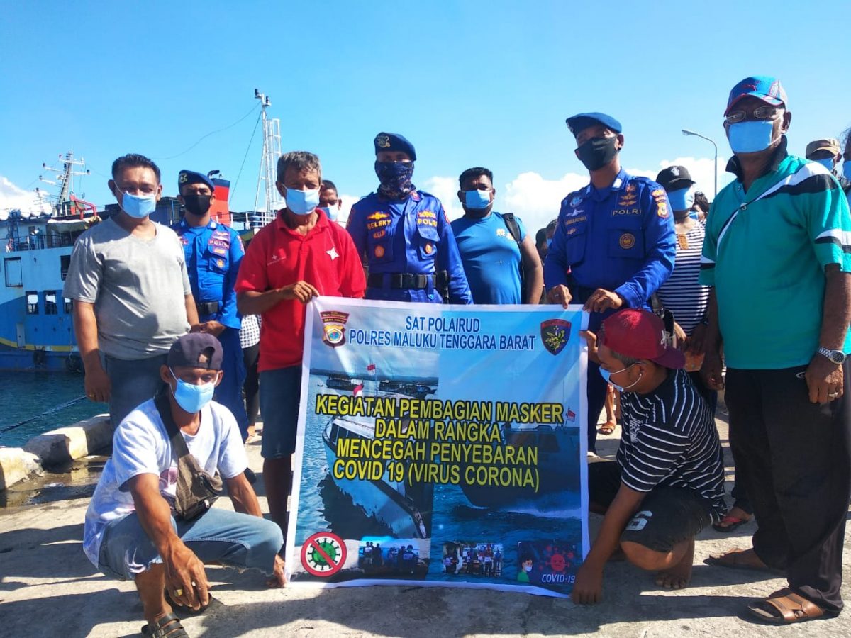 Pembagian masker yang dilakukan Satuan Polair Polres Maluku Tenggara Barat pada masyarakat pesisir yang berada di areal pelabuhan Laut Saumlaki,Kabupaten Kepulauan Tanimbar.