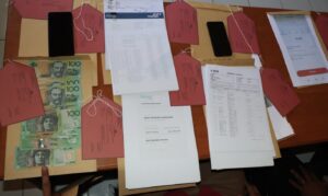 Barang bukti yang ditahan oleh penyidik berupa 17 (tujuh belas) lembar Uang Dollar Australia pecahan 100 (seratus) Dollar, 1 (satu) Unit Hp Merk Redmi 7A berwarna hitam yang digunakan WNA, 1 (unit) Hp Merk Infinix Note 8PRO milik AJ, 1 (satu) bundel Print Out Rekening Koran Bank BNI Taplus milik AJ, 1 (satu) bundel Print Out Rekening Koran Bank BCA milik ABA, 1 (satu) bundel Print Out Rekening Koran Bank BRI milik ABA dan 1 (satu) bundel Print Out Rekening Koran Bank Mandiri milik ABA.