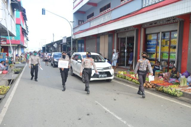 Tribratanews.polrestanimbar.com – Polda Maluku, Polres Maluku Tenggara Barat, Satuan Samapta Polres Maluku Tenggara Barat, gencar menghimbau warga Kota Saumlaki, Kabupaten Kepulauan Tanimbar untuk taat dan patuh terhadap Maklumat Kapolri tentang pencegahan Virus Corona atau Covid 19.Minggu (26/4/2020).