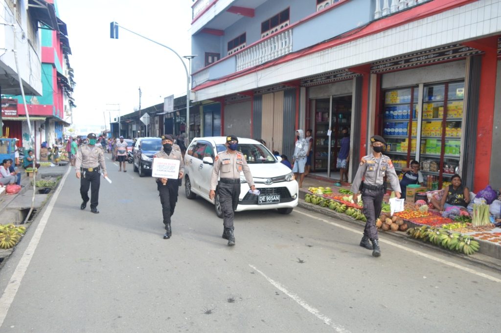 Bertempat di pertokoan yamdena plaza Saumlaki, personil Satuan Samapta Polres Maluku Tenggara Barat minghimbau para warga masyarakat yang sementara berjualan diemperan tokoh untuk dapat mematuhi instruksi pemerintah tentang pencegahan penyebaran Virus Corona atau Covid 19.