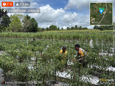 Tribratanews.polrestanimbar.com – Polda Maluku, Kepolisian Resor Kepulauan Tanimbar, Bhabinkamtibmas Desa Kabiarat, Briptu MODESTUS L. RATUANIK menyambangi warga petani yang sedang melaksanakan panen cabai di lahan pertanian Desa Kabiarat, Kecamatan Tanimbar Selatan, Kabupaten Kepulauan Tanimbar pada, Kamis (08/01/26).