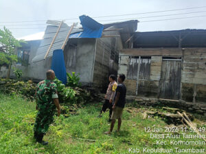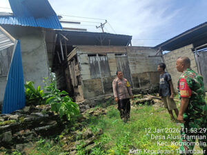 Tribratanews.polrestanimbar.com – Polda Maluku, Kepolisian Resor Kepulauan Tanimbar, Sebagai bentuk kepedulian terhadap Warga yang tertimpa musibah, Bhabinkamtibmas Desa Alusi Tamrian Brigpol A. S. G. SAINRESSY bersama Babinsa Koptu FORDATKOSU melaksanakan kegiatan sambang ke rumah salah satu Warga yang terdampak bencana alam, Senin (12/01/26).