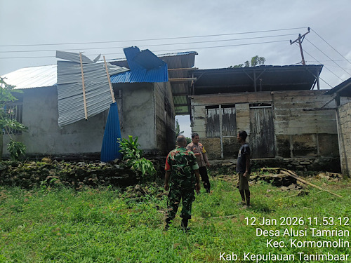 Personel TNI-Polri ini tampak meninjau langsung kondisi rumah Bapak DAVID LAMBIOMBIR pada RT 04/RW 01, di Desa Alusi Tamrian, Kecamatan Kormomolin, Kabupaten Kepulauan Tanimbar, yang mengalami kerusakan akibat terjangan cuaca ekstrem yang melanda wilayah tersebut akhir-akhir ini.