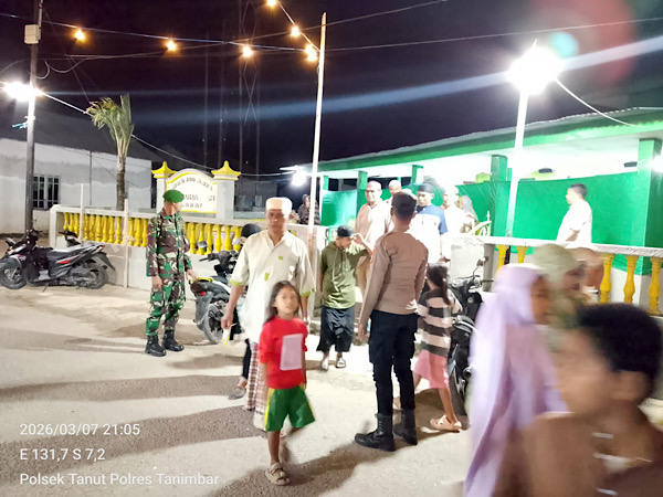 Tribratanews.polrestanimbar.com – Polda Maluku, Kepolisian Resor Kepulauan Tanimbar, Guna memastikan kekhusyukan Umat Muslim dalam menjalankan Ibadah di Bulan Suci Ramadhan 1447 H / 2026 M, personel gabungan TNI dan Polri melakukan pengamanan ketat di Masjid Al Muhajirin Larat, Kecamatan Tanimbar Utara, Sabtu (07/03/26) malam.