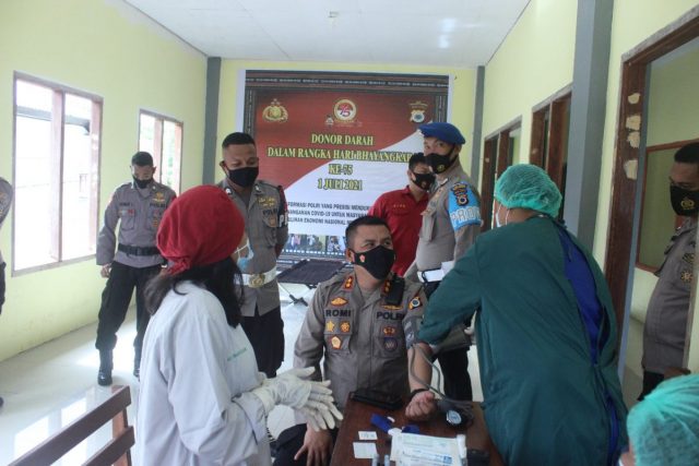 Dalam rangka menyongsong hari Bhayangkara ke-75 tanggal 01 Juli 2021, Polres Kepulauan Tanimbar dengan berkoordinasi dengan berbagai Instantsi terkait lainnya, menggelar berbagai kegiatan bhakti sosial salah satunya yang dilaksanakan dihari ini yaitu kegiatan donor darah sukarela oleh Personil Polres Kepulauan Tanimbar guna membantu masyarakat Kabupaten Kepulauan Tanimbar yang membutuhkan dalam proses operasi maupun perawatan di Rumah Sakit. Kapolres Kepulauan Tanimbar AKBP Romi Agusriansyah, S.I.K., tak hanya memantau kegiatan donor darah dimaksud namun beliau turun langsung dan ikut terlibat sebagai peserta donor darah dengan didampingi oleh Waka Polres Kompol Hendra Y. P. Haurissa, S.H., dan beberapa Perwira Staf.