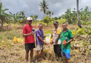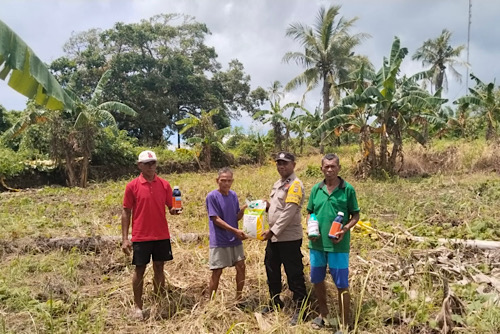 Dalam aksi nyata tersebut, Bhabinkamtibmas menyerahkan bantuan berupa 5 Kg Bibit Jagung Hibrida, 2 Botol Obat Pembasmi Rumput (Gramoxone 1 Liter) dan 1 Botol Obat Rumput (Supremo 1 Liter).