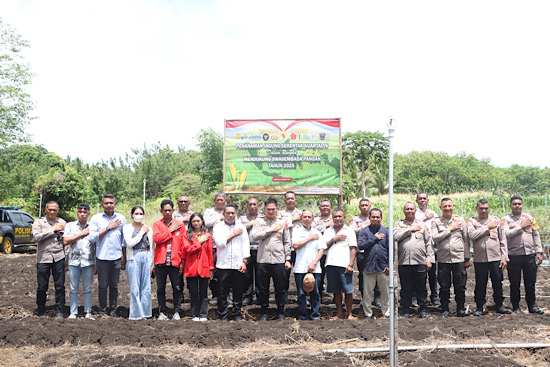Setelah Zoom meeting selesai, Kapolres Kepulauan Tanimbar bersama Dinas Ketahanan Pangan, Dinas Pertanian, para PJU Polres Kepala Bulog, Tokoh Agama, Tua Adat, beserta Perwakilan dari Mahasiswa bergerak menuju lokasi penanaman. Dengan sigap, mereka bergotong royong menanam bibit jagung di lahan yang telah disiapkan.