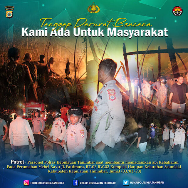 Tribratanews.polrestanimbar.com – Polda Maluku, tanggap darurat bencana Polres Kepulauan Tanimbar hadir membantu Warga memadamkan Api pada Perumahan Mebel Jln. Patimura, RT 03 RW 02 Kompleks Harapan, Kelurahan Saumlaki Selatan, Kec. Tanimbar Selatan, Kab. Kepulauan Tanimbar, Jumat (03/03).