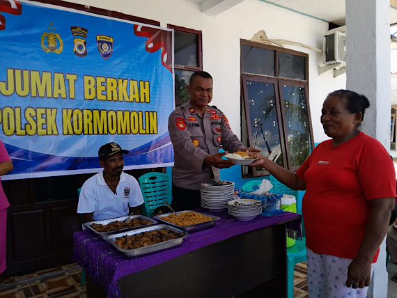 Pendekatan humanis yang dilakukan oleh Polsek Kormomolin melalui program Jumat Berkah ini bertujuan membangun kepercayaan masyarakat terhadap institusi kepolisian dan memupuk rasa kebersamaan, sekaligus membantu Masyarakat yang kurang mampu. Pada kesempatan kali ini, Polsek Kormomolin membagikan makanan siap saji kepada Warga.