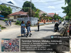 Tribratanews.polrestanimbar.com – Polda Maluku, Kepolisian Resor Kepulauan Tanimbar, Guna membentuk karakter generasi muda yang disiplin dan taat hukum, Bhabinkamtibmas Kelurahan Saumlaki, Bripka STEVEN KASTANYA melaksanakan kegiatan sambang dialogis kepada sejumlah Pelajar SMP sepulang Sekolah, Rabu (28/01/26) siang.