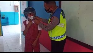 Terhadap tata cara penggunaan helm yang baik dan benar ini, Bripka A. Layan langsung mempraktekannya kepada salah satu siswa SD. Negeri 1 Saumlaki sambil memberikan petunjuk terhadap penggunaan helem dimaksud.