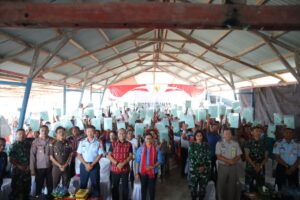 Tribratanews.polrestanimbar.com – Polda Maluku, Polres Kepulauan Tanimbar, wakili Kapolres Kepulauan Tanimbar, AKBP Umar Wijaya, S.I.K., Wakapolres Kompol Hendrik A. Rumsory, S.Sos., menghadiri kegiatan Penyerahan Sertifikat tanah oleh Presiden RI kepada masyarakat se-Indonesia secara virtual di Balai Desa Atubul Dol Kec. Wertamrian Kab. Kepulauan Tanimbar, Kamis (01/12).