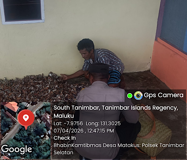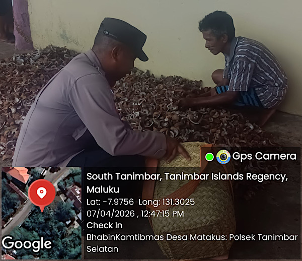 Tribratanews.polrestanimbar.com – Polda Maluku, Kepolisian Resor Kepulauan Tanimbar, Bhabinkamtibmas Desa Matakus, Bripka BRIAN CHRISTOFFEL kembali menunjukkan aksi nyata dalam mendukung produktivitas ekonomi Warga di Desa binaannya pada, Selasa (07/04/26). Selain sambang, Ia tampak membantu Warga yang sedang mengepul hasil kelapa untuk dijadikan kopra.