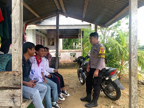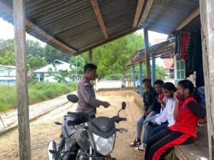Tribratanews.polrestanimbar.com – Polda Maluku, Polres Kepulauan Tanimbar, Wujudkan Polisi yang peduli terhadap Anak, Bhabinkamtibmas Desa Latdalam Briptu Dennis Junior Lawery Sambangi beberapa Pelajar SMA Negeri 2 Tanimbar Selatan ketika sedang berteduh di sebuah gang karena hujan yang cukup deras sepulang Sekolah, yang Bertempat di RT 16 RW 08, Desa Latdalam, Kecamatan Tanimbar Selatan, Kabupaten Kepulauan Tanimbar, Rabu (10/05).